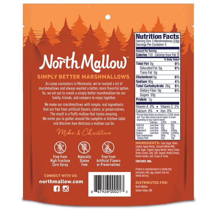 Smooth, rich caramel swirled into a light fluffy marshmallow always made with real, simple ingredients. No high fructose corn syrup, artificial flavors, or chemical preservatives. Plus, it’s naturally gluten-free. Smooth, rich caramel swirled into a light fluffy. Cane sugar, water, organic agave nectar, caramel (whole milk, cane sugar, organic agave nectar, heavy cream, butter [cream, salt], organic vanilla extract), kosher gelatin, salt, cream of tartar. Net weight 4.7 oz.