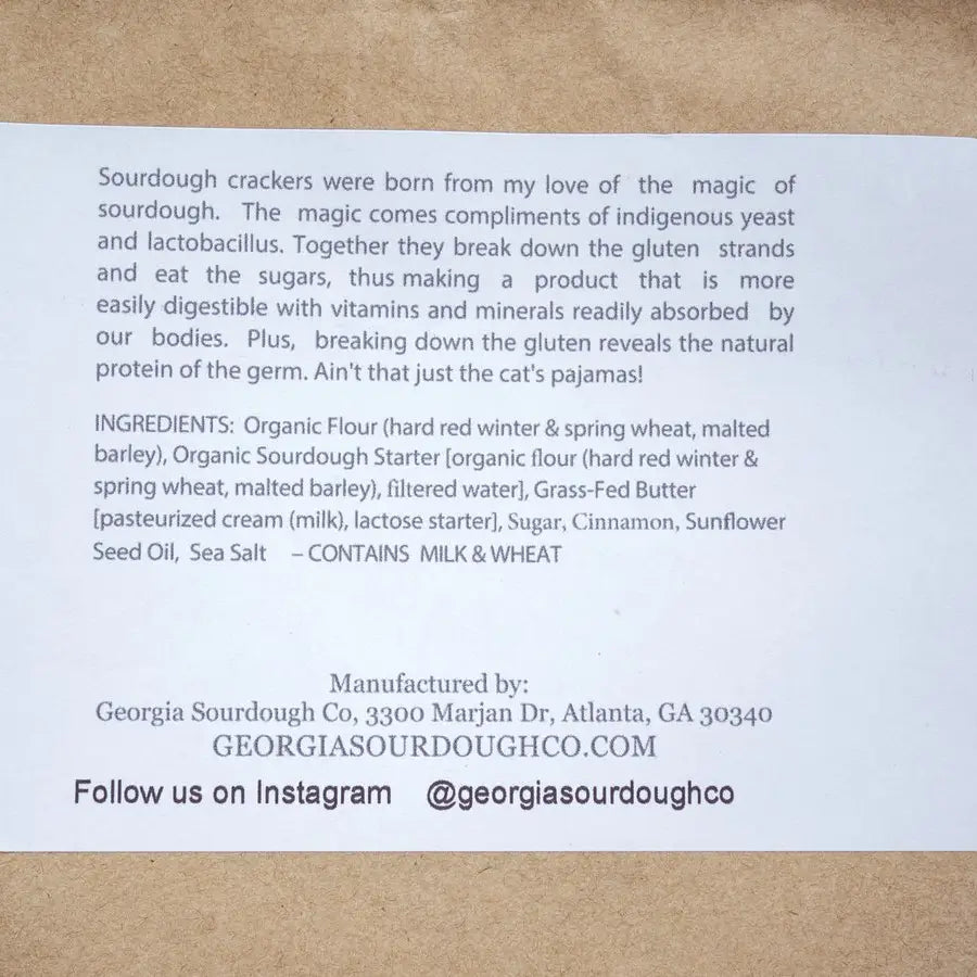 Ingredients: Organic wheat, Organic Sourdough Starter (organic flour [hard red winter & spring wheat, malted barley] filtered water], Grass-Fed Butter (pasteurized cream [milk], lactose starter), Salt, Non-GMO Cane Sugar, Cinnamon, Salt.