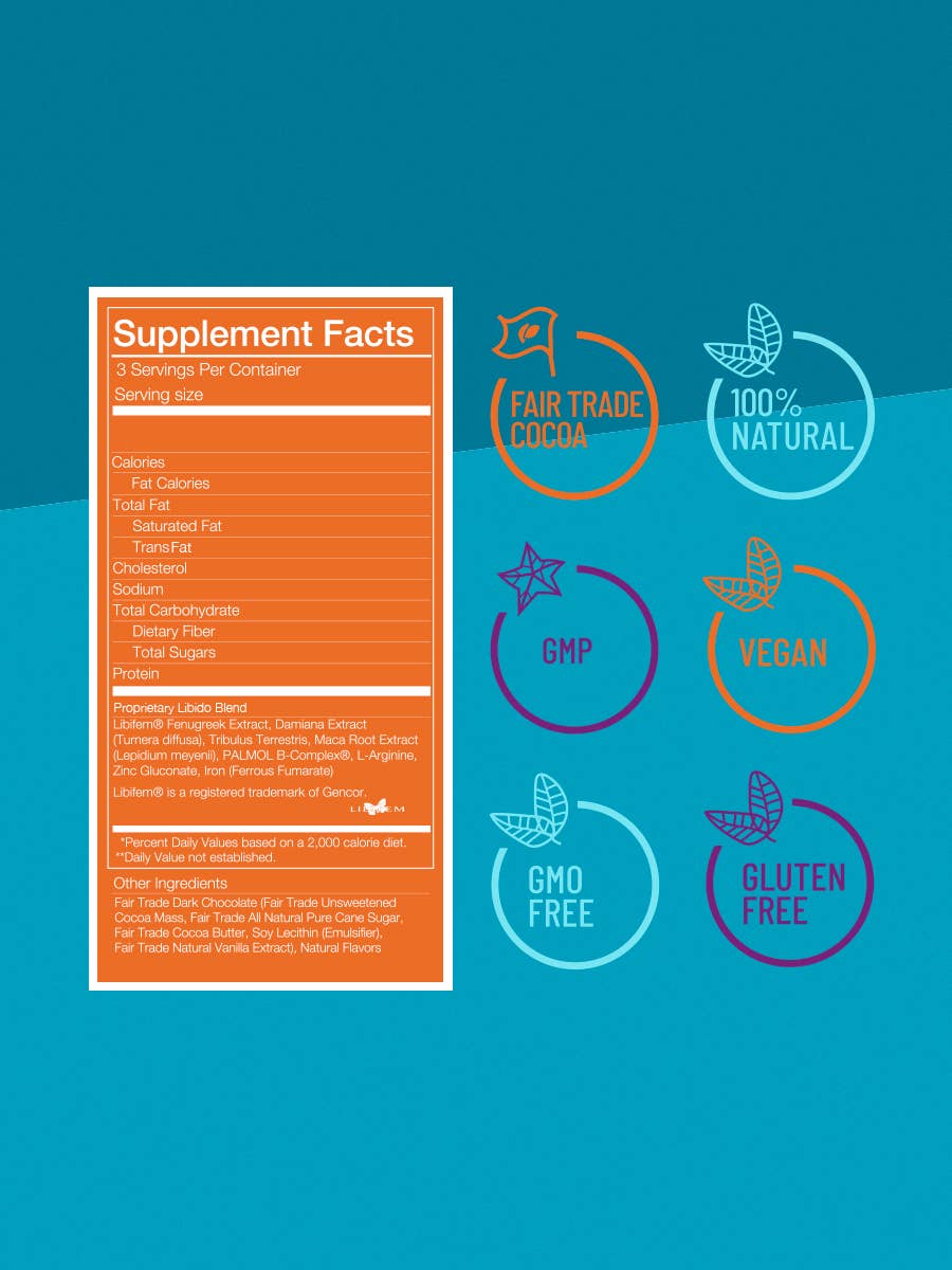 Functional Dark Chocolate formulated to address the issues associated with female libido. Clinically researched ingredients supported with vitamins, herbs & minerals, delivered in delicious dark chocolate.